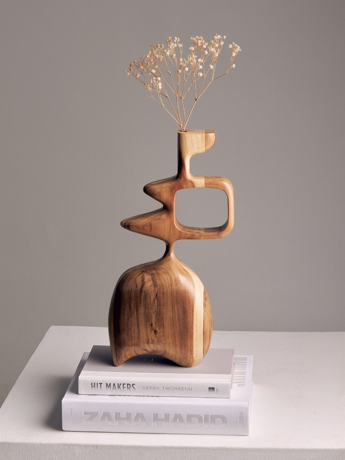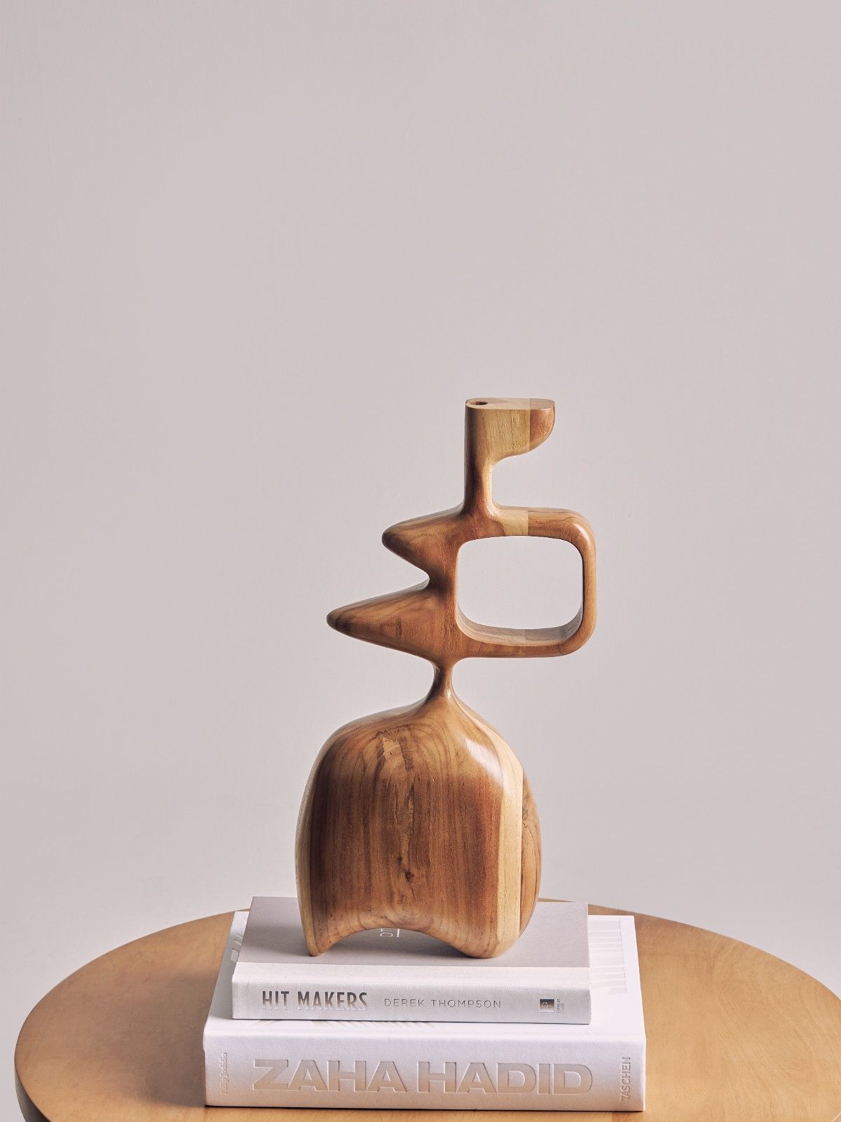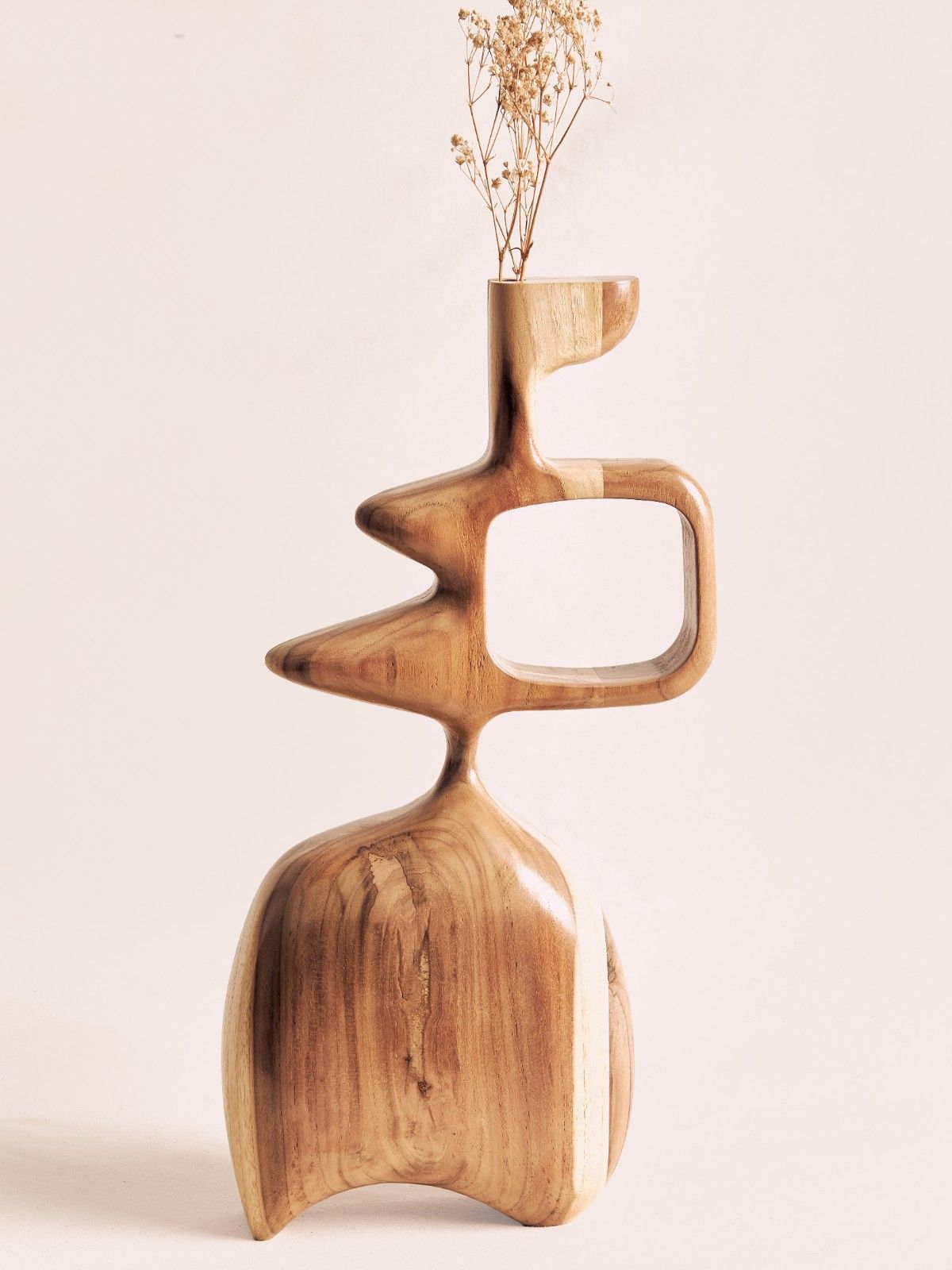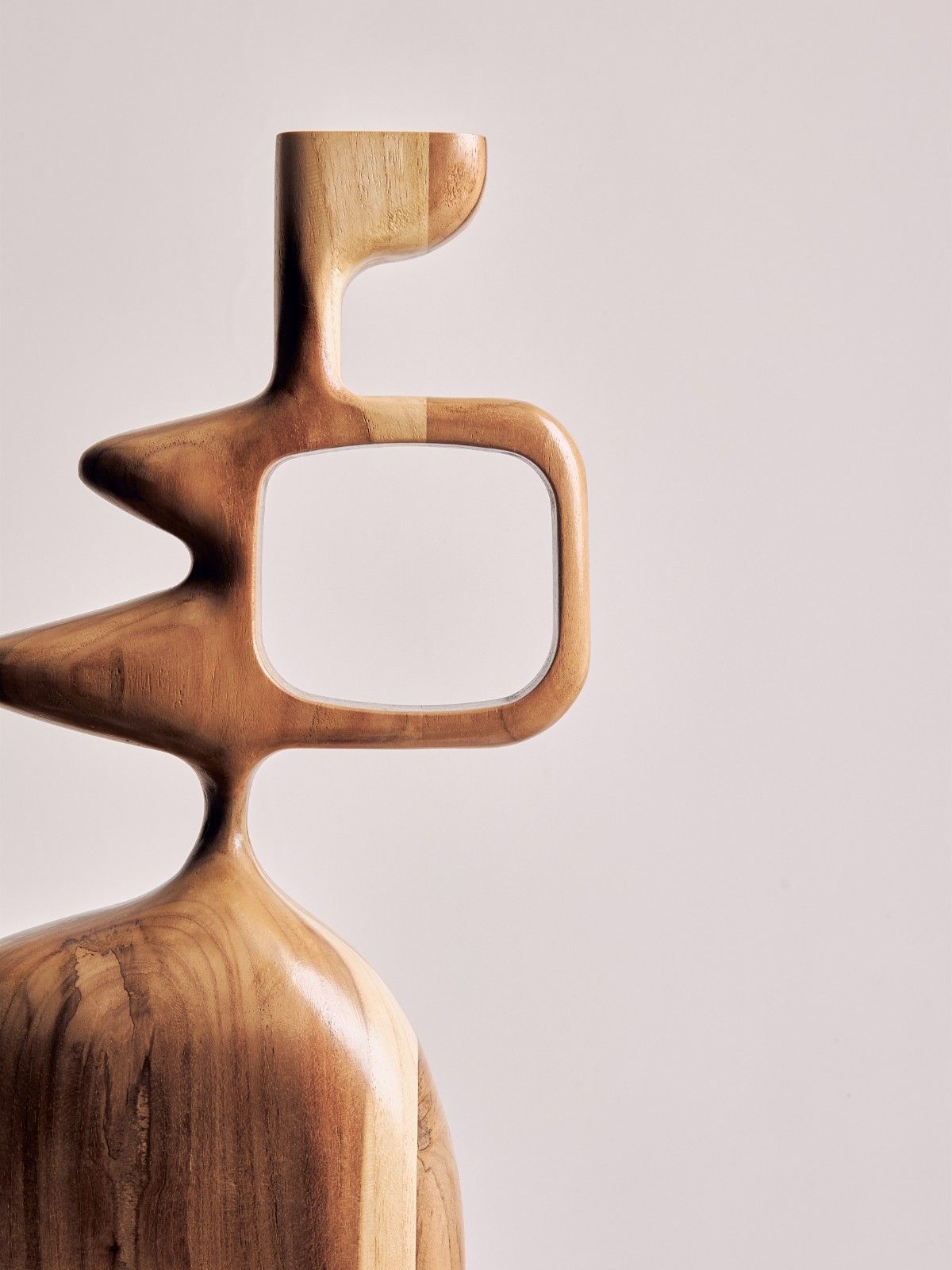 Conocer al artistaLa escultura “Ritual” es una pieza vertical tallada en madera de teca. Su diseño trabaja una silueta orgánica y controlada, construida a partir de transiciones suaves y vacíos estratégicos que generan equilibrio visual.