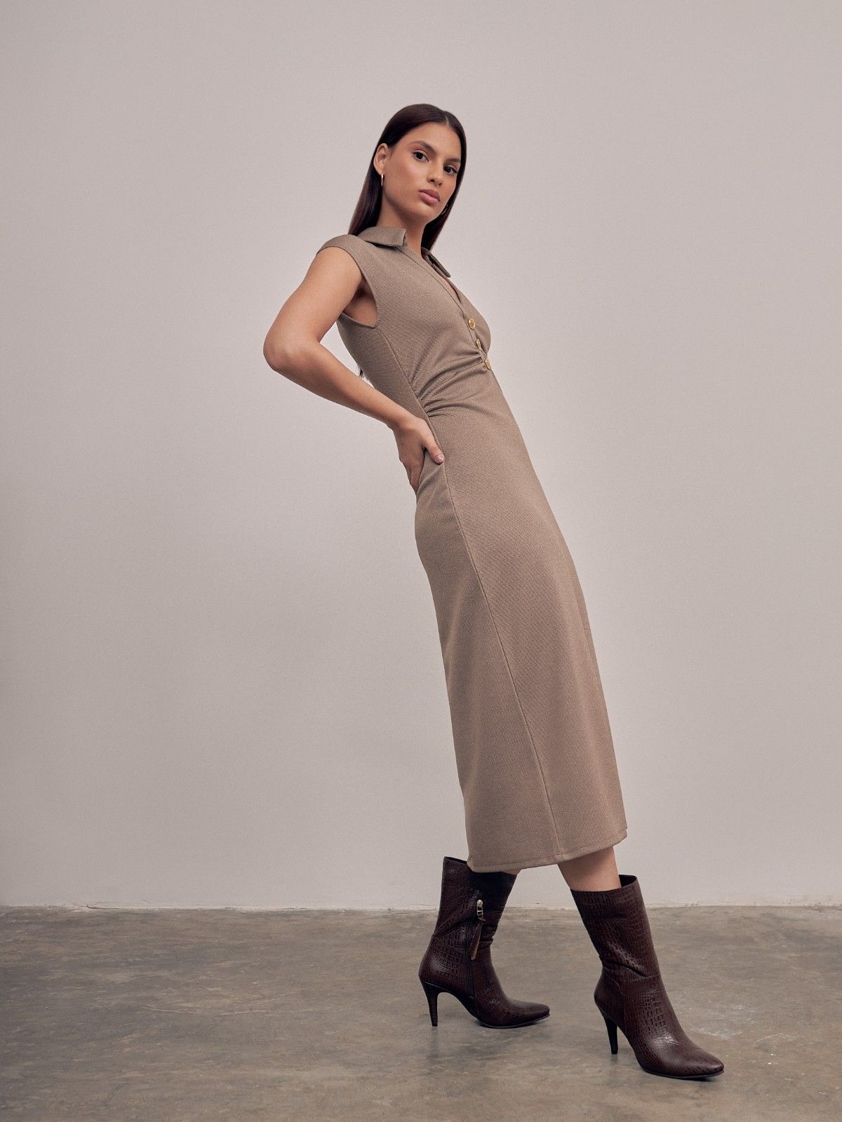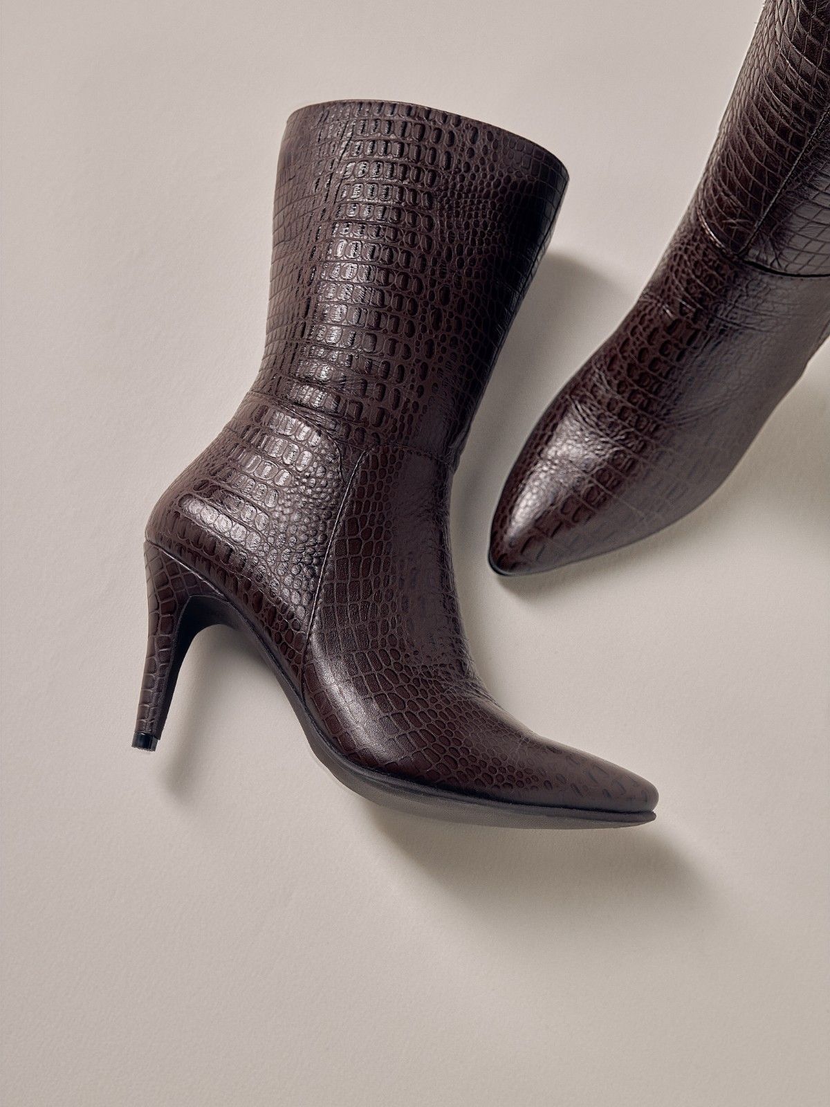 El diseño se distingue por su estructura modular: una pieza superior desmontable, que funciona como una falda envolvente, que permite transformar la bota en dos versiones. Con la pieza colocada, se presenta como una bota de presencia fuerte y estética única; al retirarla, se convierte en una bota 3/4, revelando el carácter del cuero prensado de pitón, protagonista del diseño.
