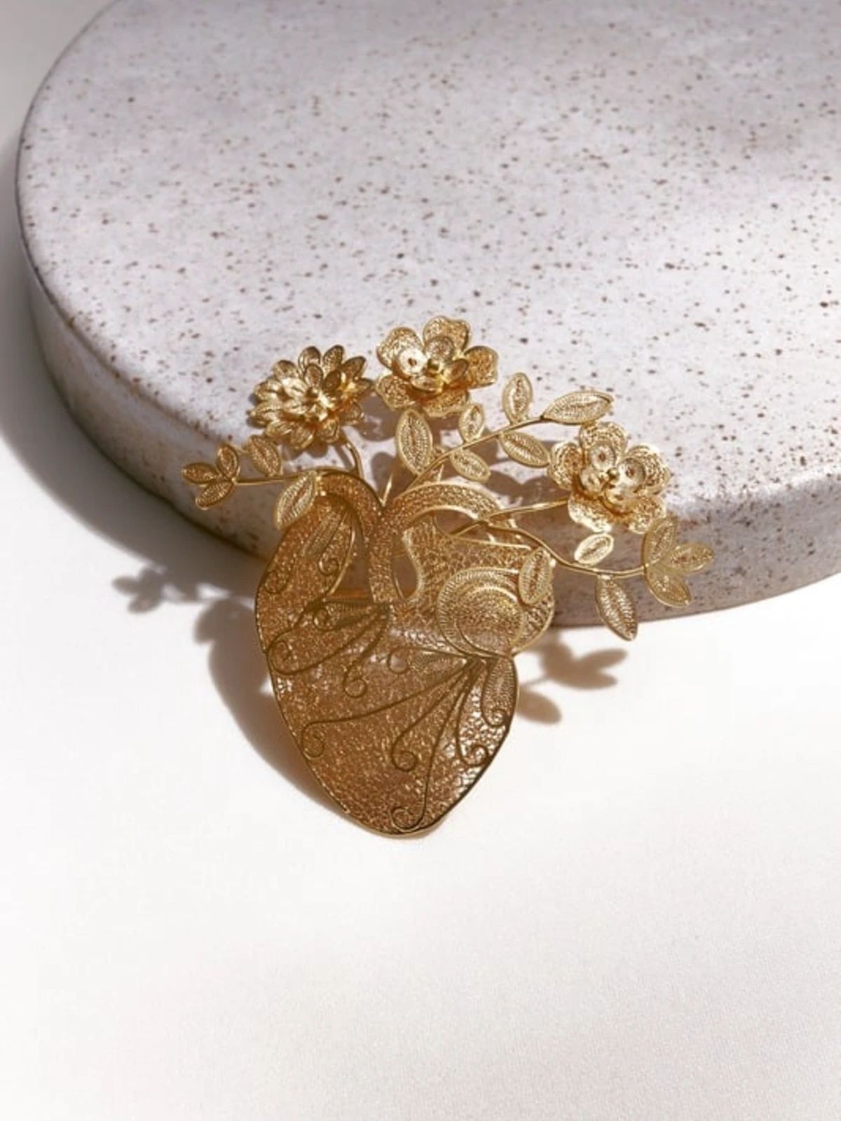 En su interior, el entramado integra flores y follajes inspirados en la flora local, manteniendo el lenguaje clásico de la filigrana floral pero aplicado a una estructura anatómica reconocible.