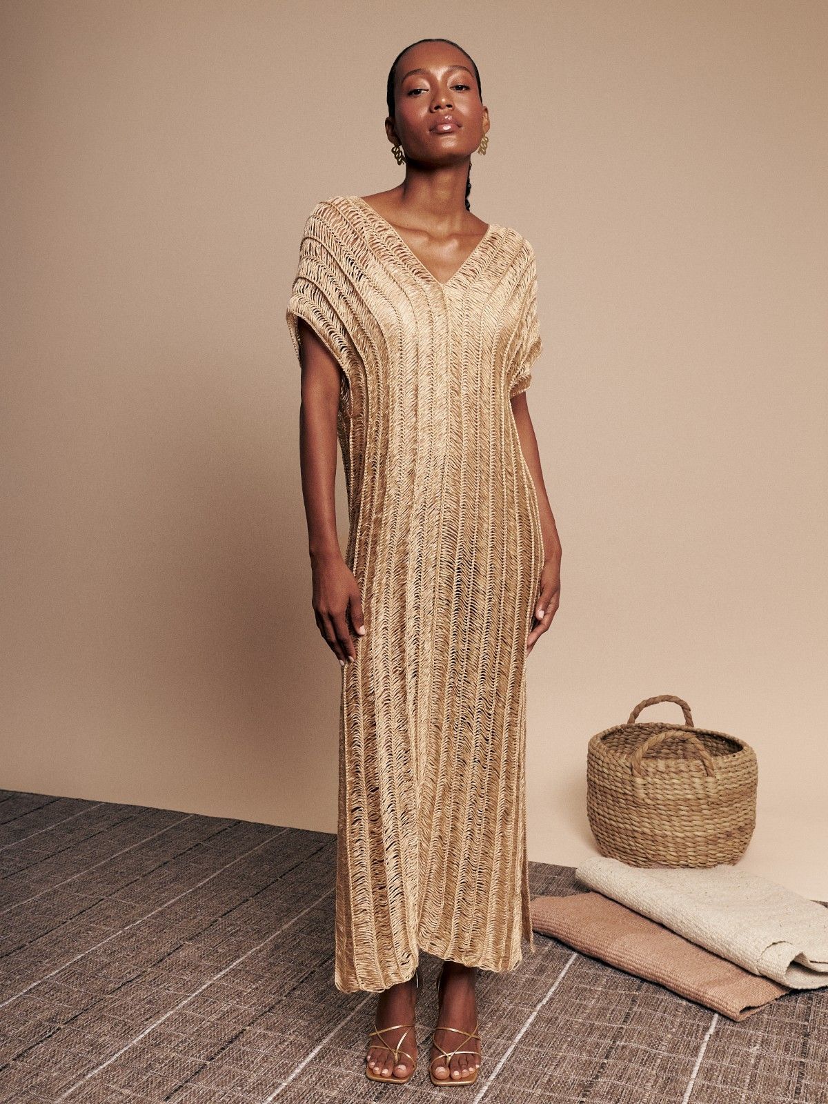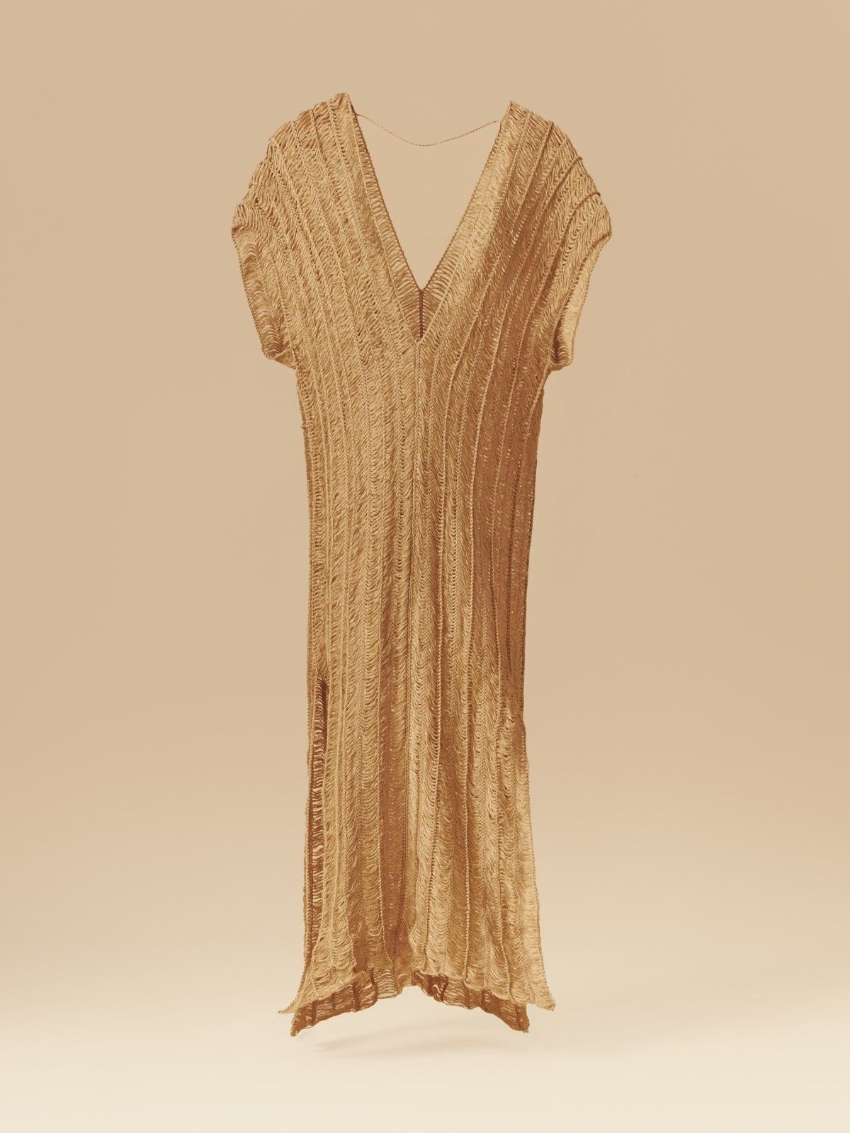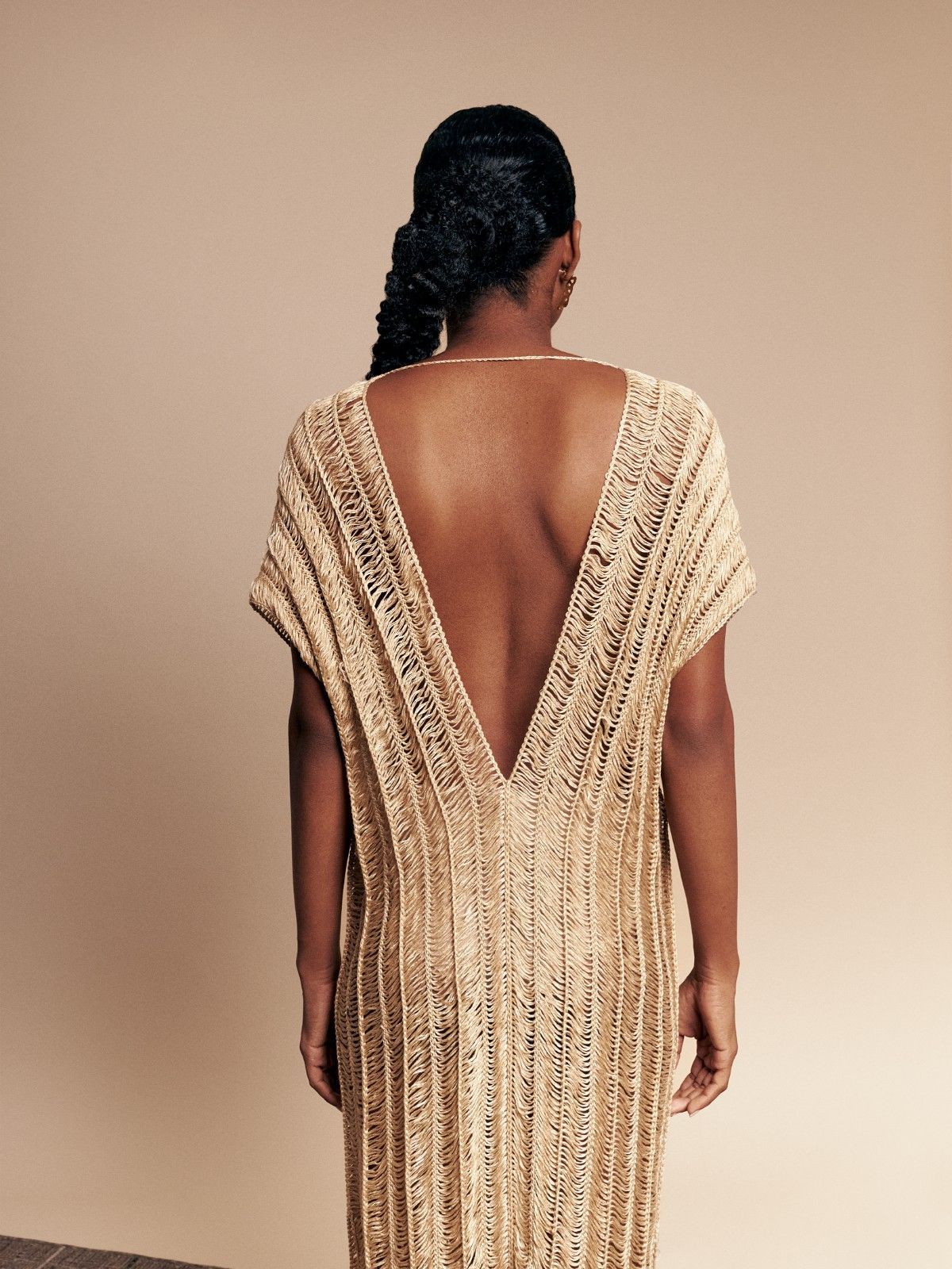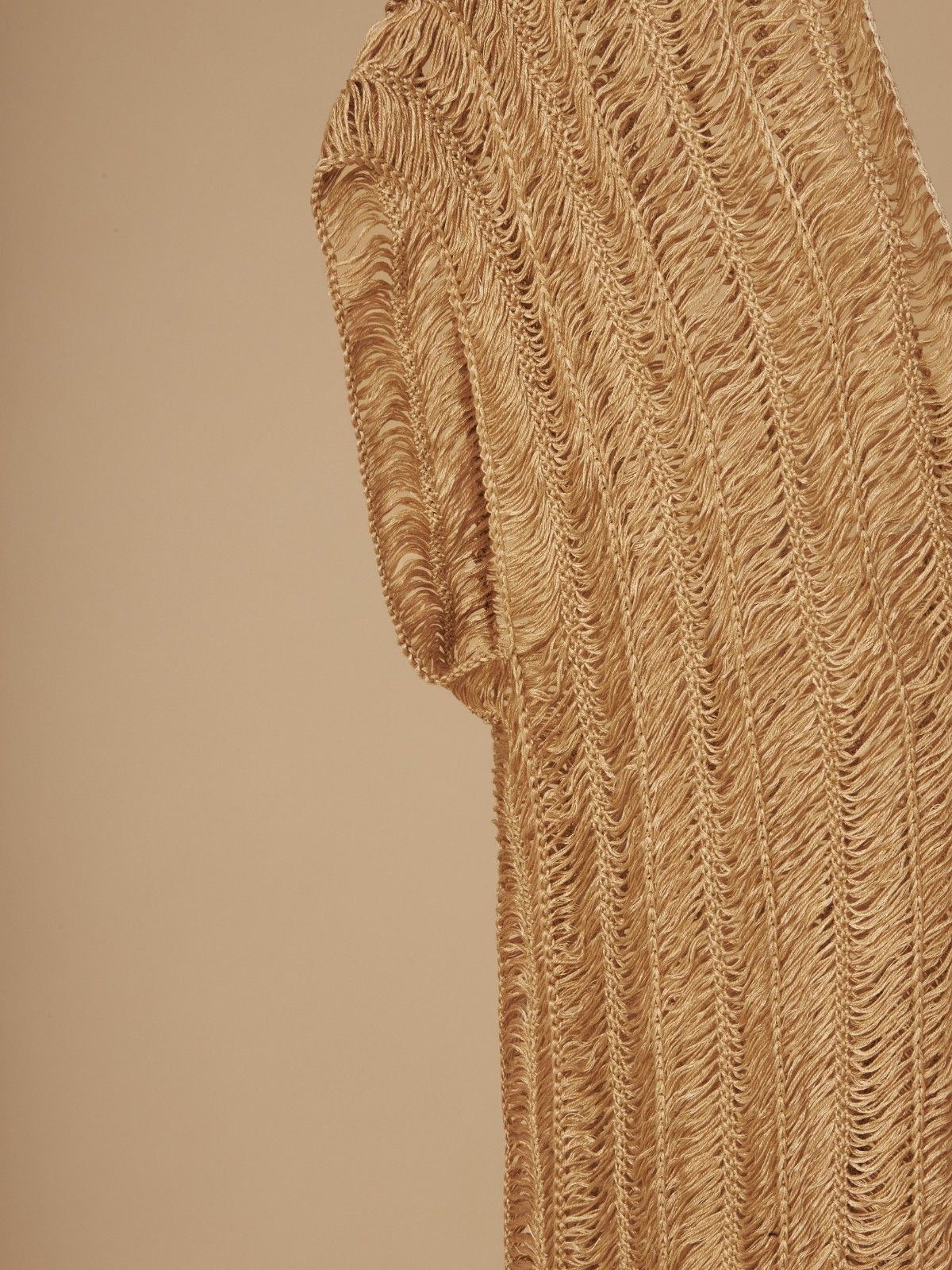 Conocer al artistaPrenda elaborada en algodón mercerizado y seda morera natural, tejida mediante técnica de horquilla y crochet. La silueta tipo campana se construye a partir de módulos unidos de forma visible, generando una costura estructural que atraviesa la pieza.