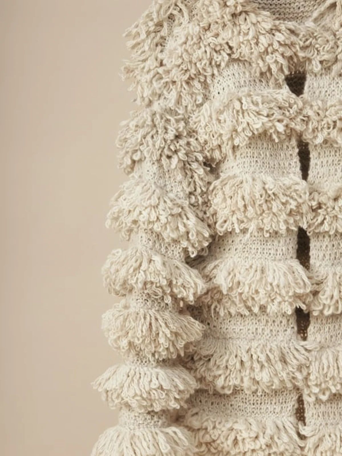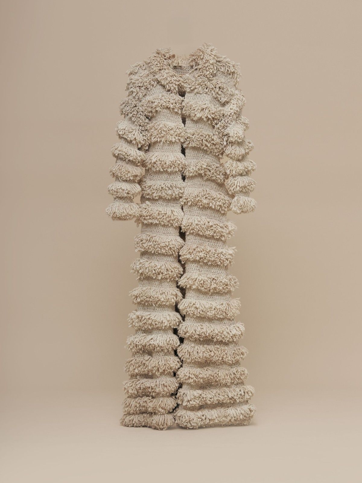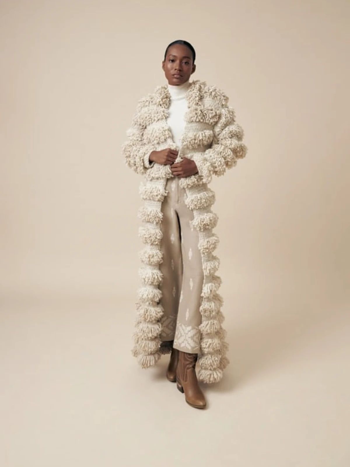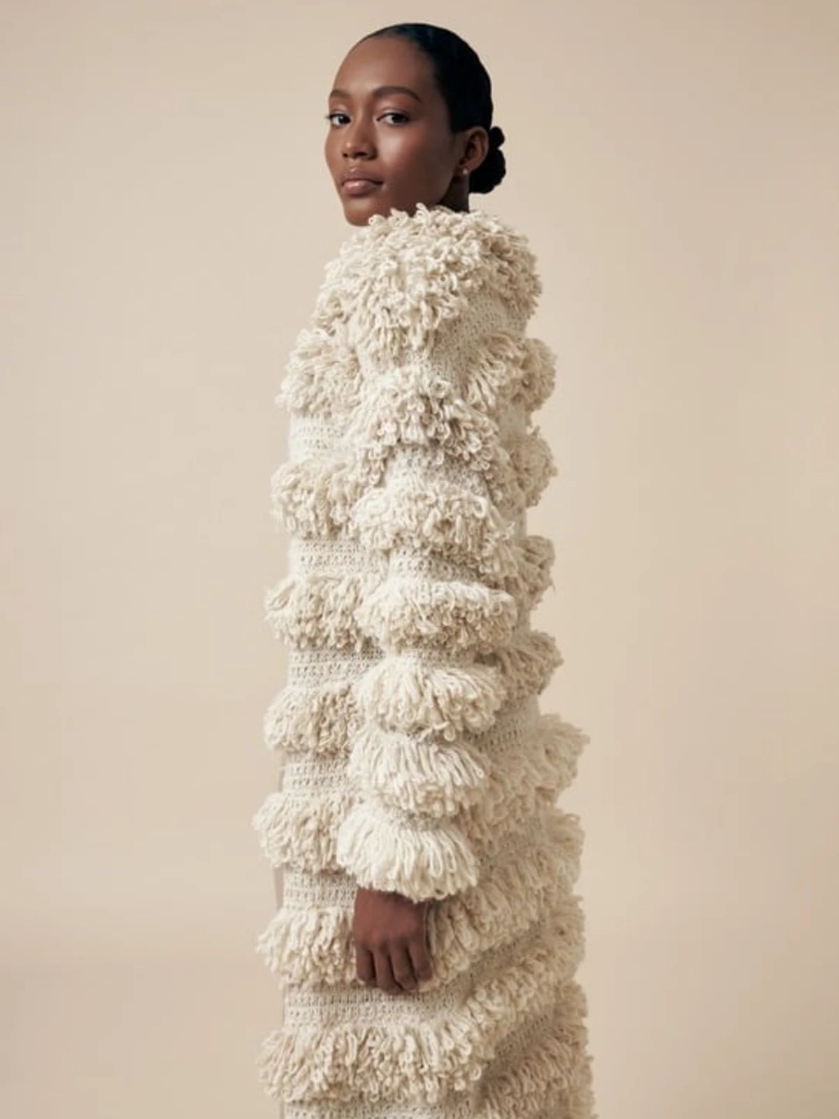 Conocer al artistaAbrazo de Niebla es un manto–abrigo elaborado en fibra pura de alpaca baby, tejido a mano mediante técnicas tradicionales andinas. Su textura rizada evoca el encuentro simbólico entre la niebla del páramo y la suavidad de la alpaca, generando una prenda de abrigo envolvente.