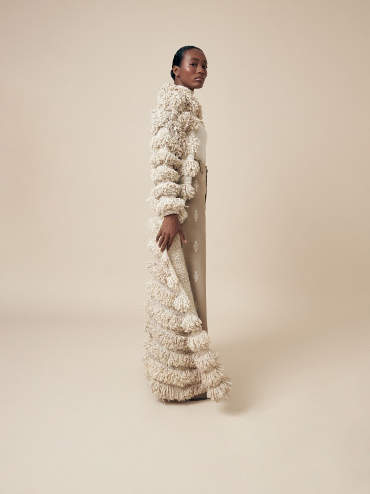El diseño propone una silueta amplia que privilegia la experiencia sensorial del cuerpo, permitiendo que la pieza se habite más que simplemente se use. La prenda honra la tradición textil andina desde una mirada contemporánea, destacando el valor del tiempo y del trabajo artesanal.